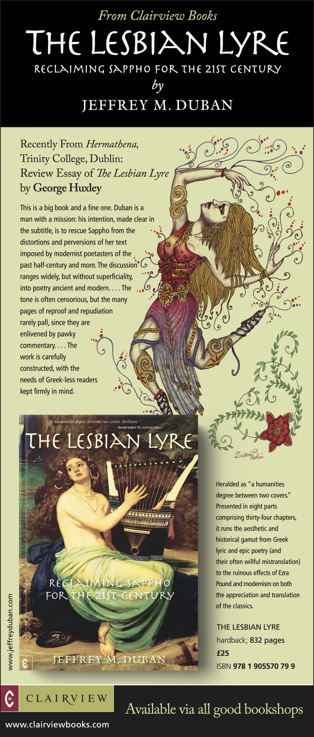 “The Lesbian Lyre offers a bracing and very welcome challenge to the twentieth century dominance of ‘personal voice’ translations of Greek lyric, Sappho in particular, by translators with scant or no Greek but great self-confidence in their own intuition of what the Greek should say. The trend for ‘poet-translators’ to work from cribs and paraphrases has undoubtedly been deplorable, both in conception and results. The polemics of Jeffrey Duban’s argument are very clear, with Ezra Pound the chief villain in the piece. The book promises both to resurrect some forgotten but remarkably effective translations of Greek lyric and to offer new renderings of Sappho in translations reflecting the simple and formal beauties of her lyrics while calling upon the full resources of the English poetic tradition.”